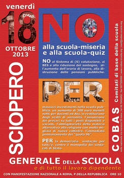 Infatti l'elemento centrale del nostro sciopero del 18 ottobre sarà proprio il rifiuto della scuola-miseria con la richiesta di massicci investimenti nella scuola pubblica bene comune e l'assunzione dei precari su tutti i posti disponibili nella convinzione che i devastanti provvedimenti che anche il governo Letta continua a portare avanti, possono essere contrastati solo con una forte mobilitazione che veda studenti e lavoratori della scuola uniti per riconquistare diritti e democrazia reale.